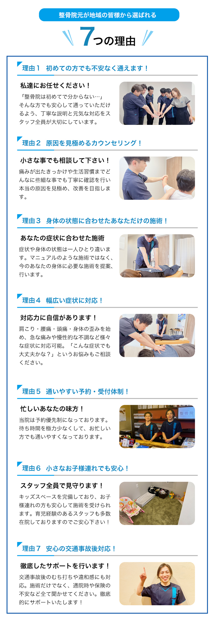 - 痛みの根本原因を見極めて施術する点が大きな違いです。その場の気持ちよさだけでなく、「なぜ痛みが出ているのか」を確認したうえで施術するため、改善と再発予防を目指せます。