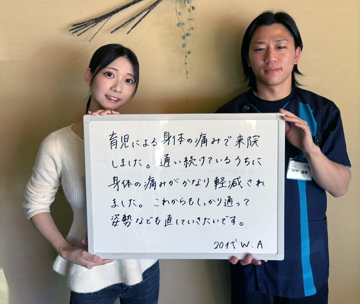 育児による身体の痛みで来院しました。通い続けているうちに身体の痛みがかなり軽減されました。これからもしっかり通って姿勢なども直していきたいです。首肩の痛みの悩み