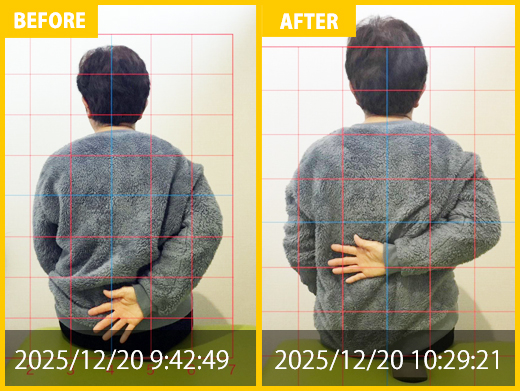 スタート時と比べると、腰の専門施術にて痛みが改善。首肩の痛みの悩み