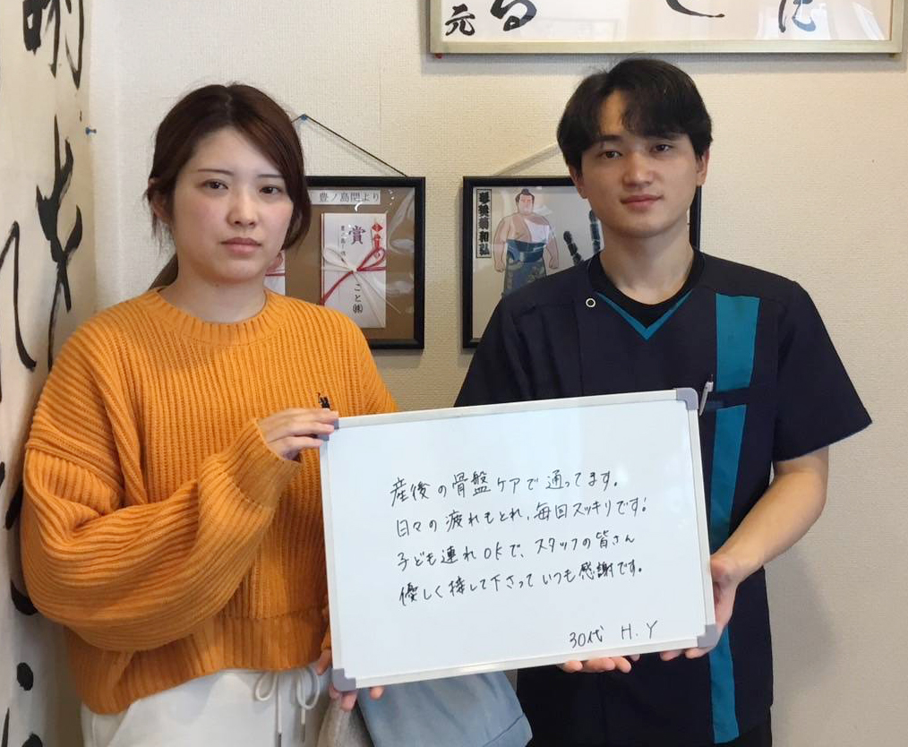 産後の骨盤ケアで通っています。日々の疲れもとれ、毎回スッキリです!子ども連れOKで、スタッフの皆さん優しく接して下さっていつも感謝です。頭痛の悩み