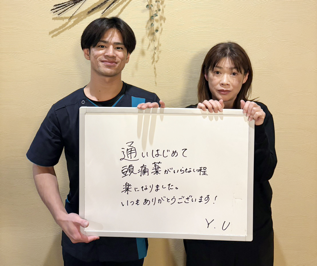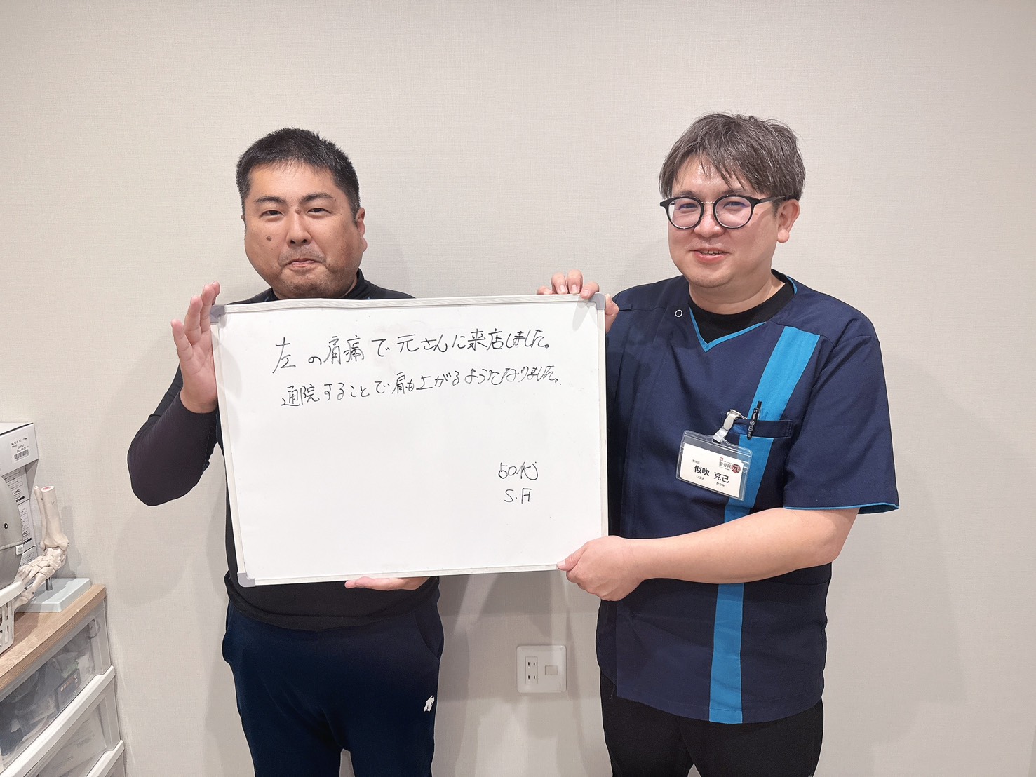 通いはじめて頭痛薬がいらない程楽になりました。いつもありがとうございます!左肩の悩み