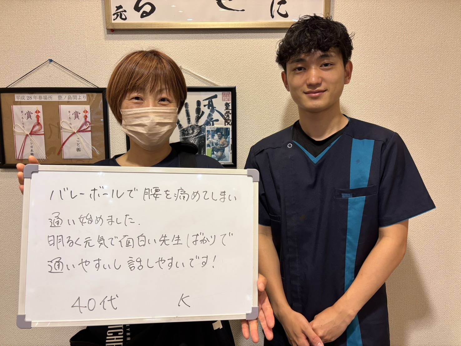 バレーボールで腰を痛めてしまい通い始めました。明るく元気で面白い先生ばかりで通いやすいし話やすいです!