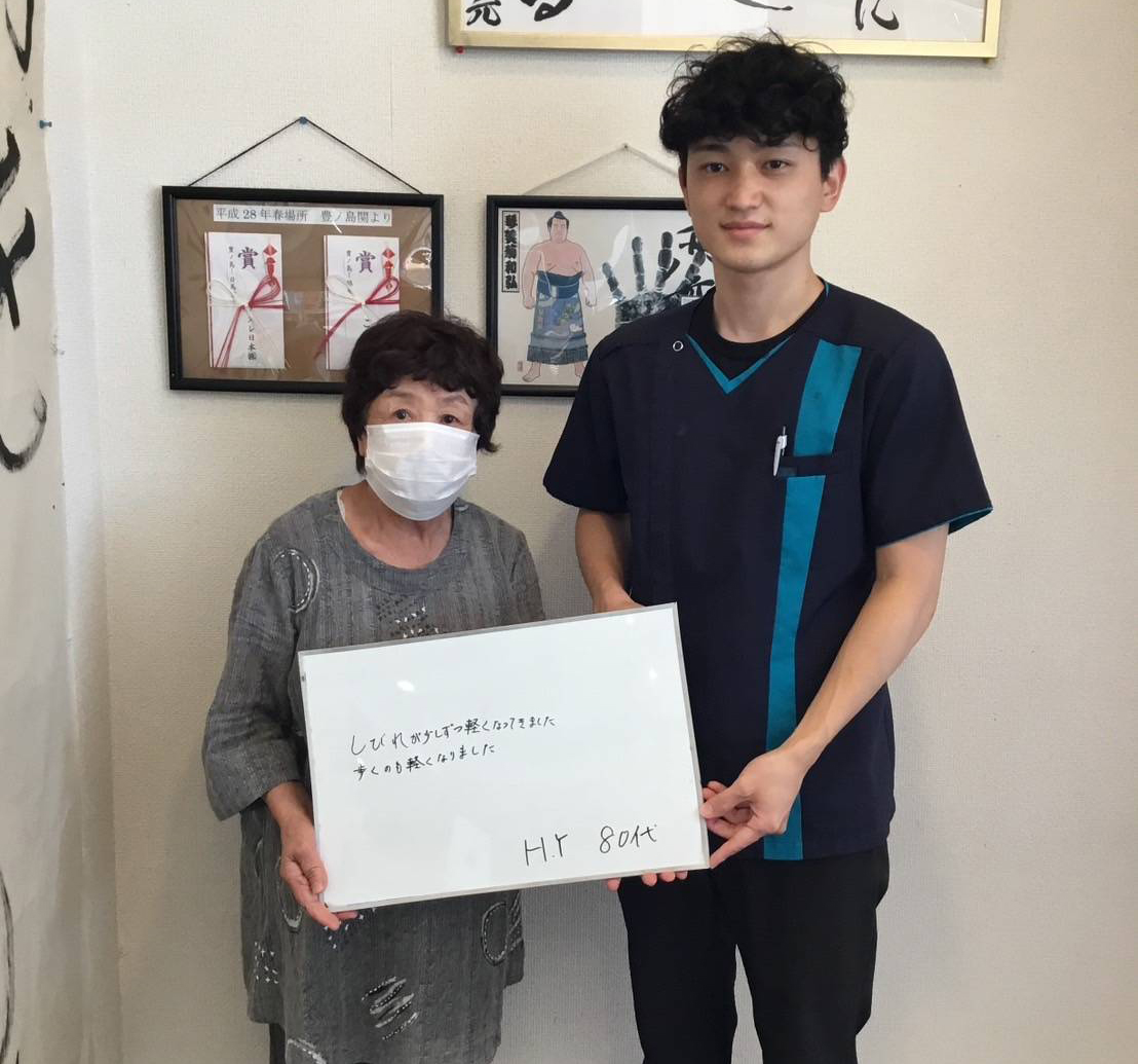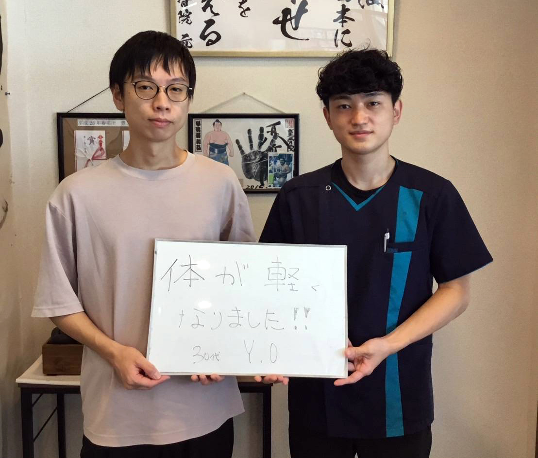 腰痛がひどく、張りや鈍い痛みがありましたが、施術後、痛みが取れてスッキリしました。前屈もバッチリです。スポーツメンテナンス