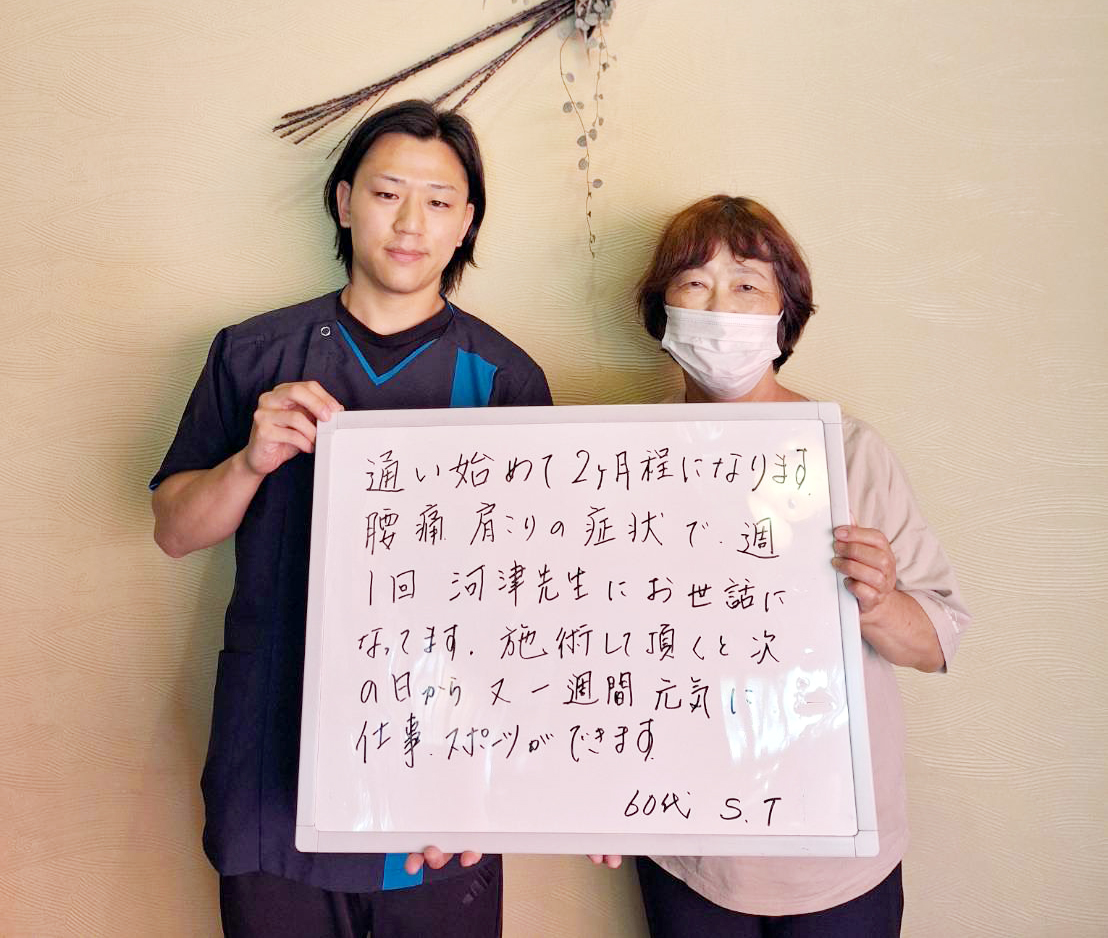 通い始めて2ヶ月程になります。腰痛、肩こりの症状で、週1回、河津先生にお世話になってます。施術して頂くと次の日から又一週間元気に仕事、スポーツができます。坐骨神経痛の悩み