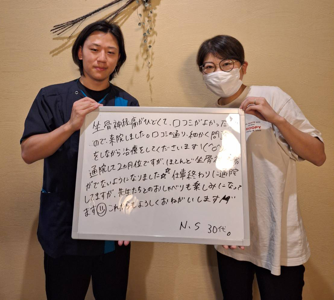 坐骨神経痛がひどくて、口コミがよかったので来院しました。口コミ通り細かく問診をしながら治療をしてくださいます(^^)通院して2ヶ月位ですが、ほとんど坐骨神経痛がでないようになりました。仕事終わりに通院してますが、先生たちとのおしゃべりも楽しみになってます(^^)/これからもよろしくおねがいします。身体の悩み